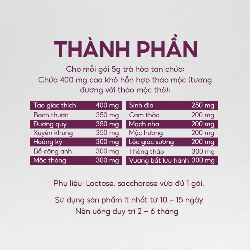 - Tạo giác thích, Bạch thược, Đương quy, Xuyên khung – những “bảo bối” của Đông y, kết hợp hài hòa, kích thích tuyến sữa hoạt động mạnh mẽ, cho dòng sữa về êm ái, dạt dào.