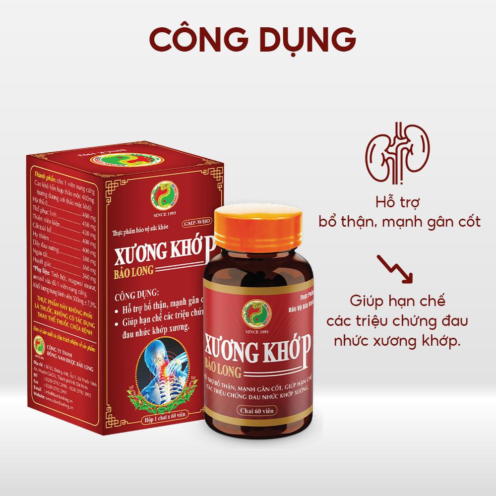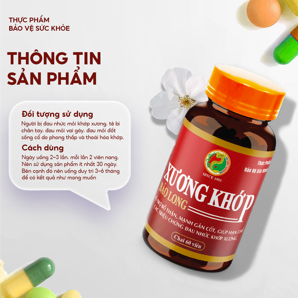 Đừng để nỗi đau xương khớp kìm hãm bạn! Hãy để sản phẩm Xương Khớp Bảo Long đến từ công ty Đông Nam Dược Bảo Long giúp bạn giải phóng khỏi những cơn đau,hỗ trợ tái tạo sụn khớp, bồi bổ gân cốt, cho bạn tận hưởng trọn vẹn từng bước chân tự do, mỗi ngày đều là một ngày tràn đầy năng lượng và niềm vui.