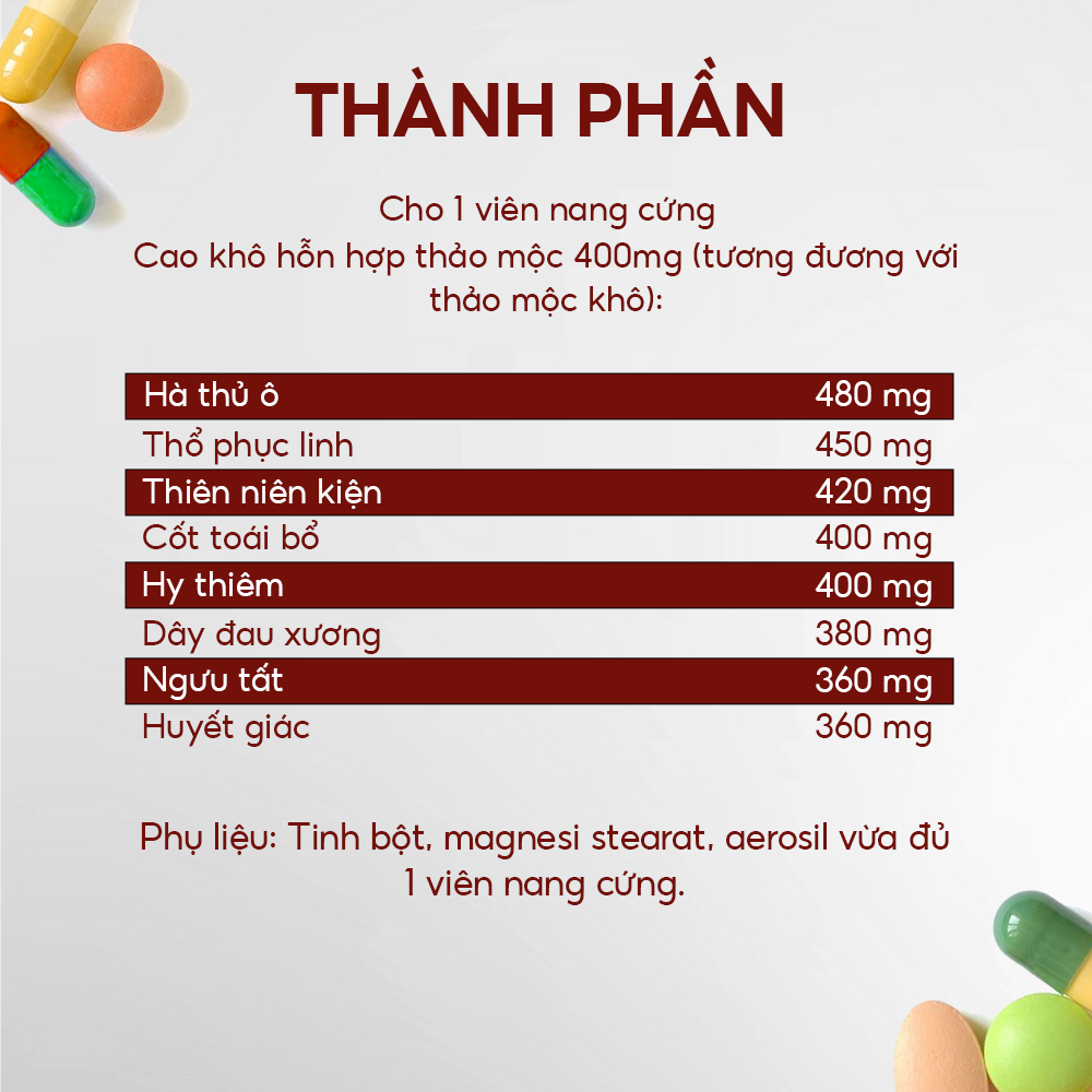 • Hà Thủ Ô: Vị thuốc bổ huyết, hoạt huyết, mạnh gân cốt, giúp giảm đau, chống viêm, tăng cường sức khỏe xương khớp.