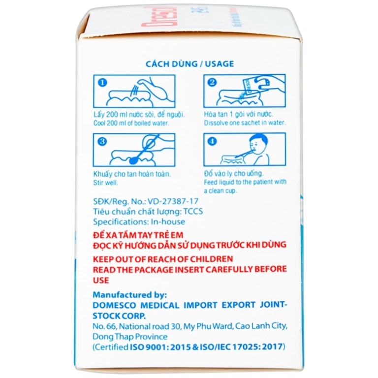 Oresol 245 Domesco dùng đường uống. Pha 1 gói vào 200 ml nước đun sôi để nguội (không pha với nước khoáng).