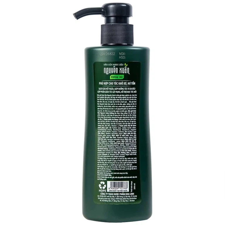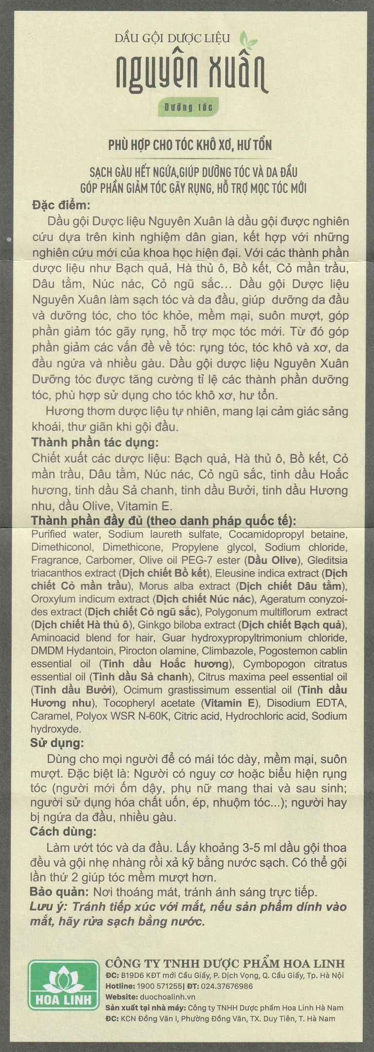 Dầu gội dược liệu Nguyên Xuân là dòng sản phẩm dầu gội được nghiên cứu và sản xuất bởi Công ty TNHH Dược phẩm Hoa Linh. Dầu gội Nguyên Xuân xanh lá thuộc dòng sản phẩm chăm sóc tóc, được nghiên cứu và phát triển từ các bài thuốc dân gian cùng với các loại thảo dược và vị thuốc cổ truyền quý hiếm. Sản phẩm hiện đang được đánh giá cao bởi có hiệu quả tốt trong việc nuôi dưỡng tóc, chăm sóc da đầu, làm giảm tình trạng gãy rụng tóc và kích thích mọc tóc. Đồng thời giảm tình trạng ngứa ngáy, sự hình thành gàu hiệu quả.