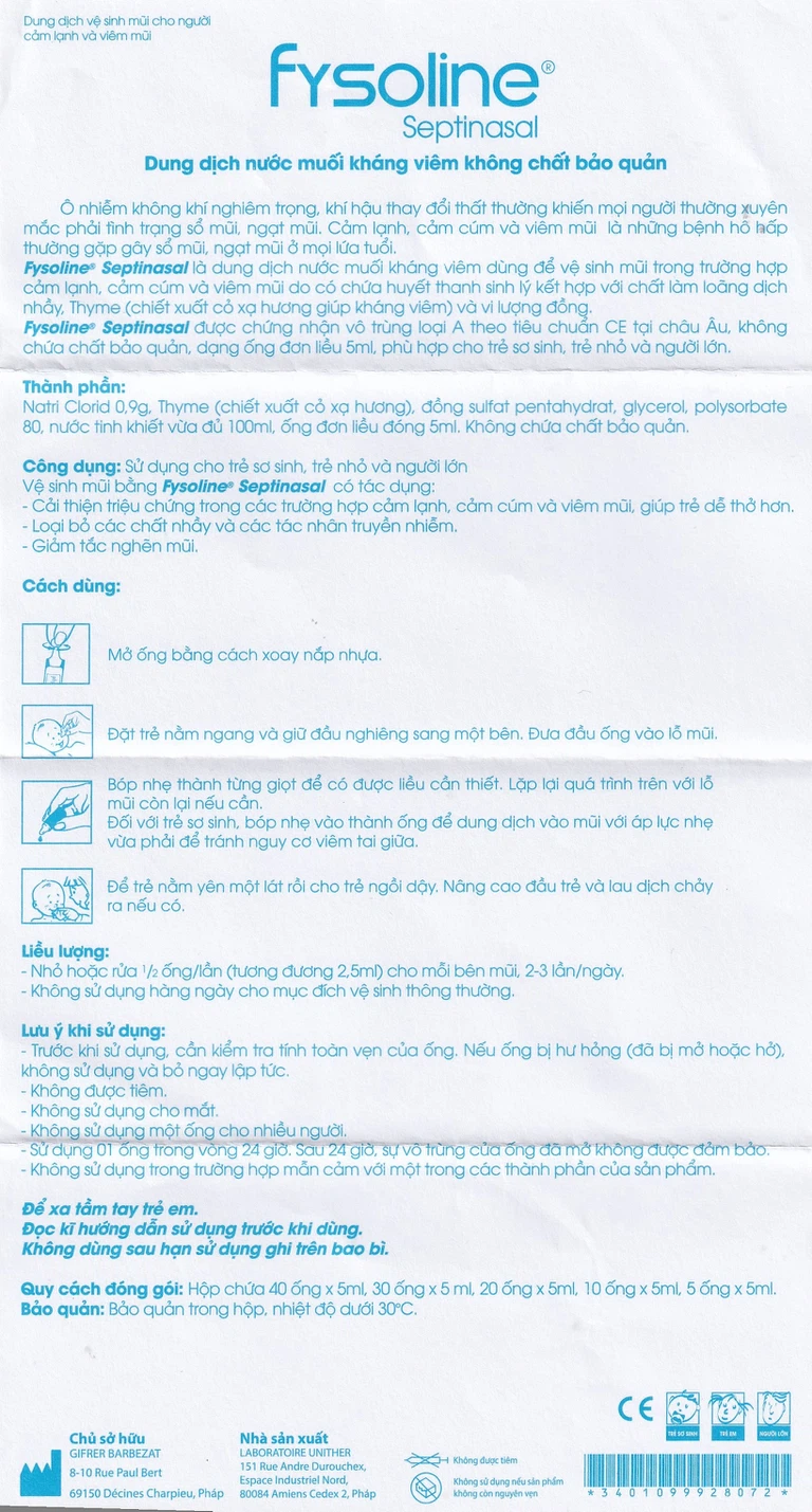 Fysoline Septinasal Gifrer là loại nước muối sinh lý kháng viêm. Đây là sản phẩm không phải kháng sinh nhưng có tác dụng hỗ trợ điều trị các bệnh viêm, nhiễm khuẩn như viêm mũi, sổ mũi, nghẹt mũi an toàn cho trẻ sơ sinh và trẻ nhỏ.