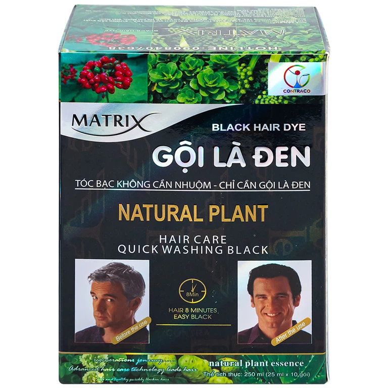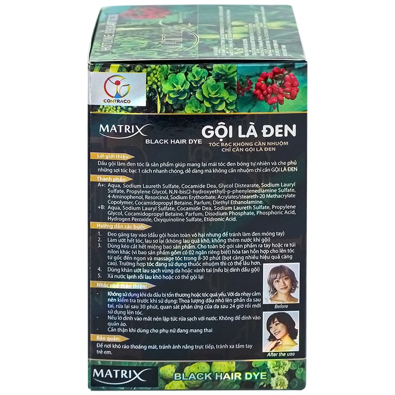 Gội Là Đen Matrix có khả năng làm thay đổi màu tóc nhanh, hiệu quả và an toàn, giúp che phủ những sợi tóc bạc mà vẫn cho độ thẩm mỹ cao, dễ dàng sử dụng và không cần nhuộm. Với Gội Là Đen Matrix, mái tóc chuyển đen óng tự nhiên nhưng vẫn mượt mà, chắc khỏe, không gây khô rát da đầu như các loại thuốc tẩy nhuộm thông thường.