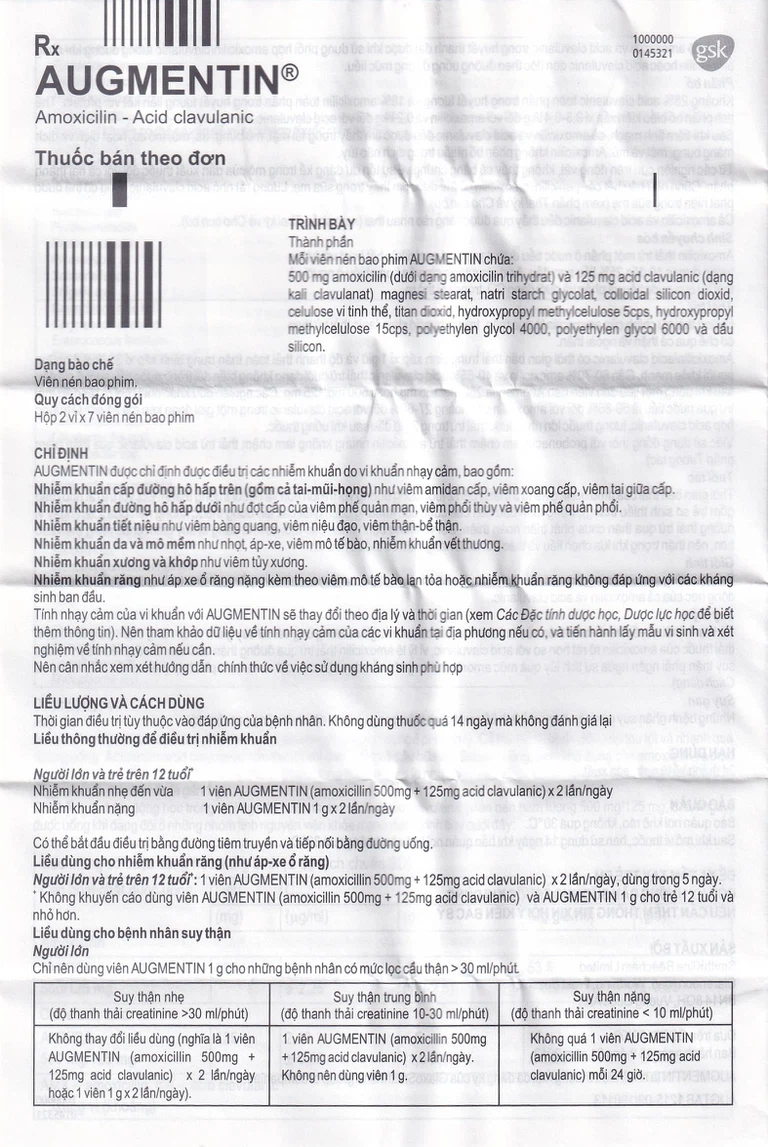 Suy thận nhẹ (Creatinin > 30 ml/phút): 625 mg x 2 lần/ngày hoặc 1 viên 1g x 2 lần/ngày.