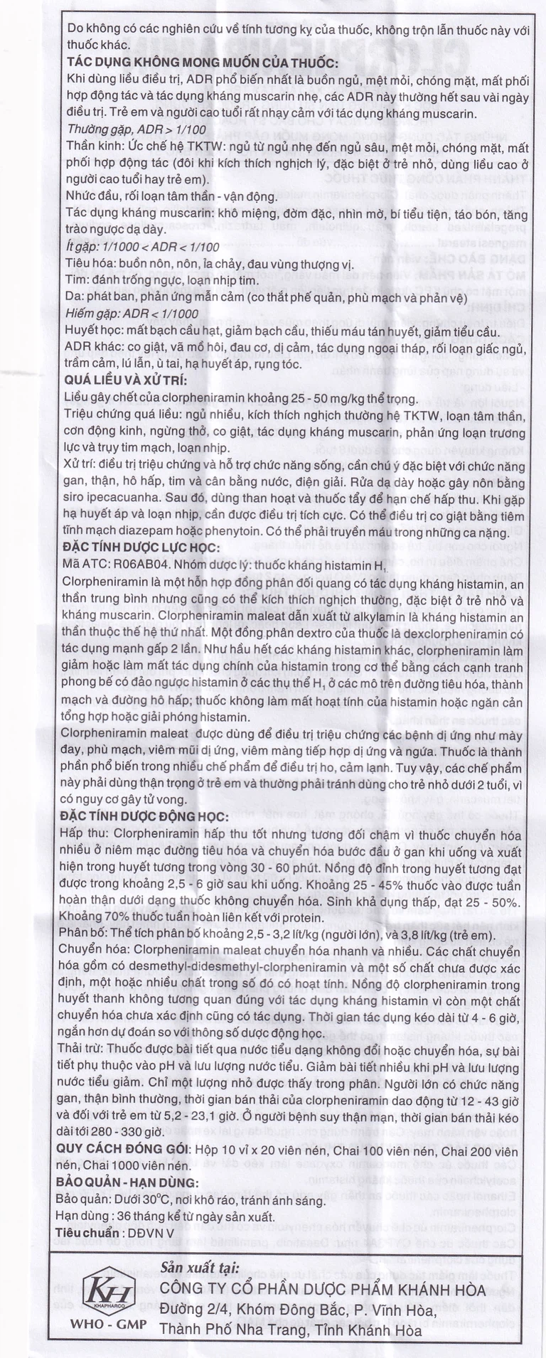 Thuốc Clorpheniramin là sản phẩm của Công ty Cổ phần Dược phẩm Khánh Hòa có thành phần chính là Clorpheniramine Maleate dùng điều trị triệu chứng viêm mũi dị ứng theo mùa và quanh năm, mày đay.