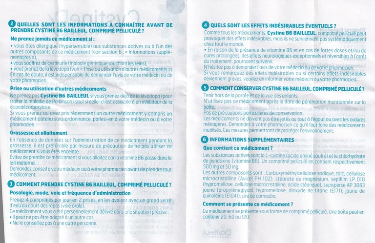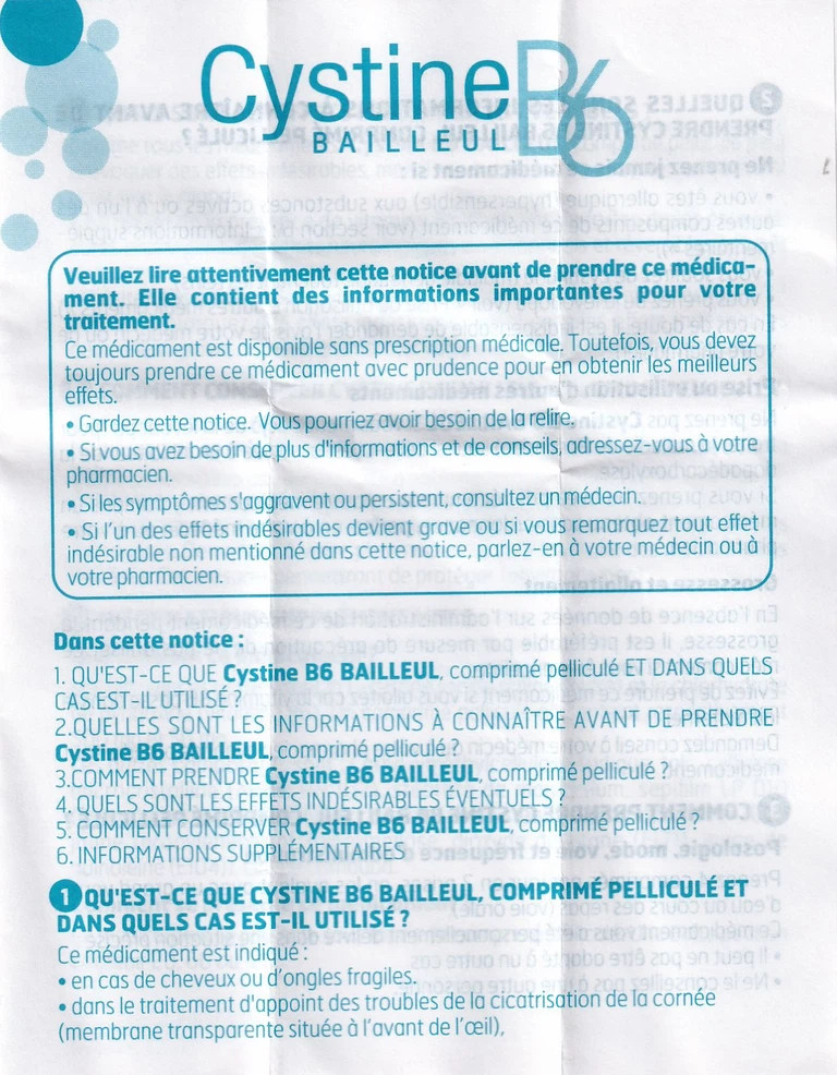 Cystine B6 của Laboratories Galéniques Vernin, thành phần chính L-Cystin và Pyridoxin hydrochlorid. Đây là thuốc dùng để điều trị mọi vấn đề bệnh lý liên quan đến tóc: Rụng tóc, tóc chẽ, tóc dễ gãy… đặc biệt, rụng tóc từng mảng, rụng tóc lan tỏa cấp tính (sau sang chấn, phẫu thuật, nhiễm trùng, hậu sản, dùng một số thuốc), rụng tóc do nội tiết tố nam. Loạn dưỡng móng: Móng dễ gãy, móng quá mềm, móng bị tách đôi, móng mọc chậm… Ngoài ra, cũng nên dùng trong nấm móng vì thuốc làm móng mọc nhanh hơn, giúp tăng hiệu quả của thuốc kháng nấm, chậm liền sẹo giác mạc.