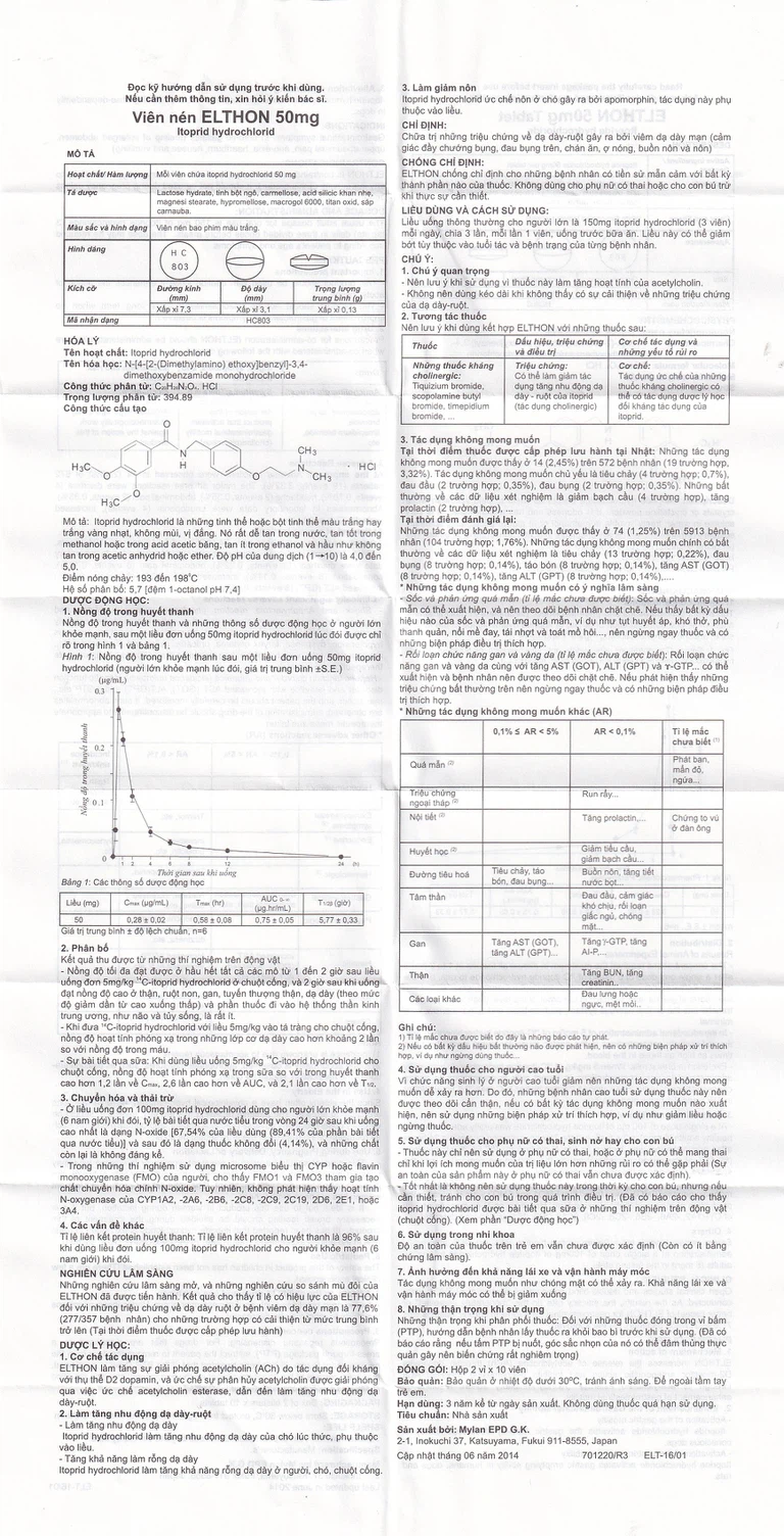 Thuốc Elthon 50mg của Công ty Abbott Japan Co., Ltd – Nhật Bản, thành phần chính Itoprid Hydrochlorid 50mg là loại thuốc được dùng để điều trị các triệu chứng dạ dày ruột gây ra bởi khó tiêu chức năng, khó tiêu không do loét (viêm dạ dày mãn tính): Đầy bụng, chướng bụng, đau/khó chịu vùng bụng trên, ăn mau no, chán ăn, ợ nóng, buồn nôn, nôn.