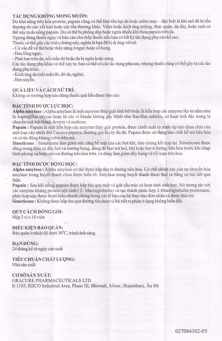 Grazyme của Công ty Gracure Pharmaceutical LTD, thành phần chính alpha amylase, papain và simeticone, là thuốc dùng để điều trị ăn không ngon; khó tiêu; tức bụng; đầy hơi; giảm protein máu; đầy bụng sau khi ăn và thiếu enzyme. Grazyme được xem như một enzyme hỗ trợ tiêu hóa, kích thích tiêu hóa sau phẫu thuật đường tiêu hóa và trong nhiều bệnh gây rối loạn hấp thu như thiểu năng tụy và xơ nang tụy.