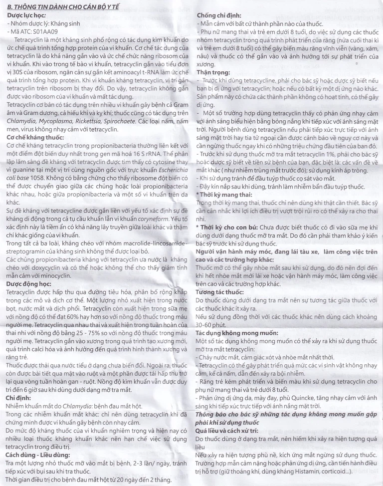 Công dụng của Thuốc mỡ tra mắt Tetracyclin 1%