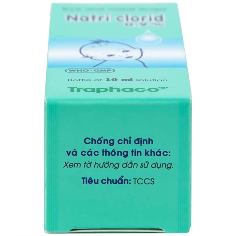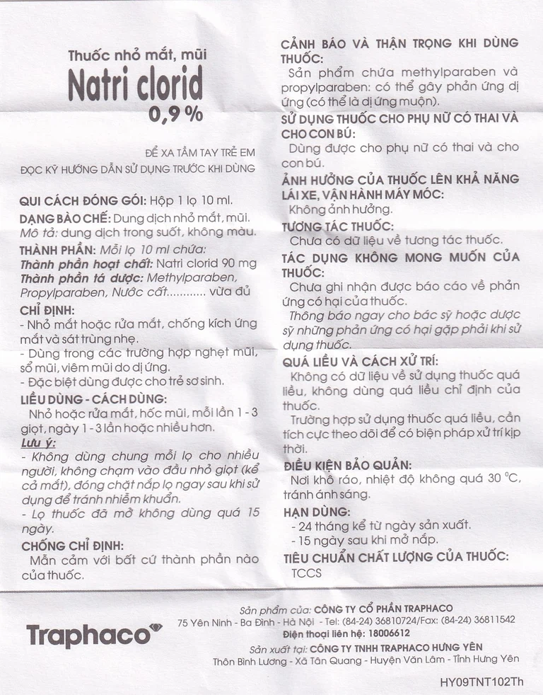 Natri clorid 0,9% được sản xuất bởi Công ty Cổ phần Traphaco. Natri clorid 0,9% là dung dịch được dùng rửa mắt, chống kích ứng mắt và sát trùng nhẹ. Hoặc được dùng nhỏ mũi để giảm những triệu chứng như nghẹt mũi, chảy mũi, viêm mũi do dị ứng.