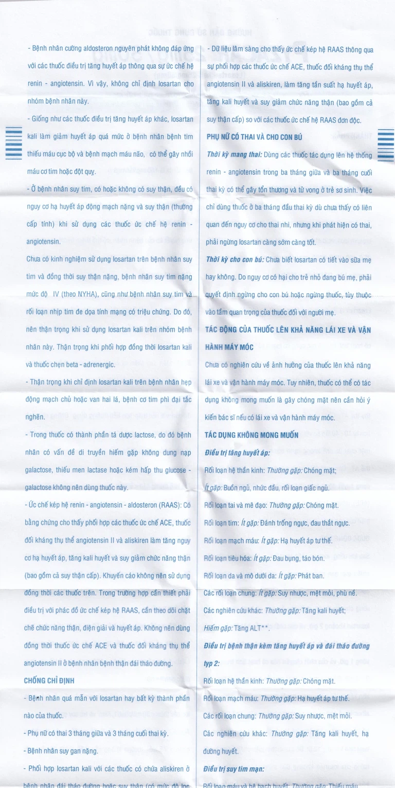- Phối hợp losartan kali với các thuốc có chứa aliskiren ở bệnh nhân đái tháo đường hoặc suy thận (có mức độ lọc cầu thận GFR < 60 ml/phút/1,73 m2).