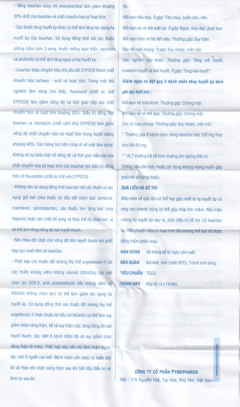 *Thường gặp ở bệnh nhân dùng losartan kali 150 mg thay cho liều 50 mg.