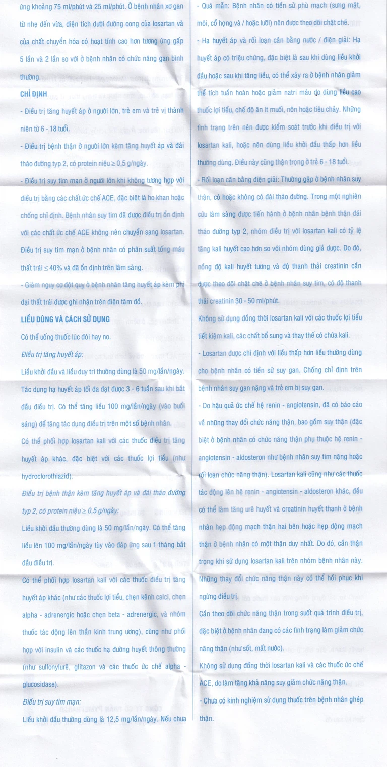 - Dữ liệu về hiệu quả và độ an toàn của losartan kali ở trẻ từ 6 tháng đến < 6 tuổi chưa được chứng minh.