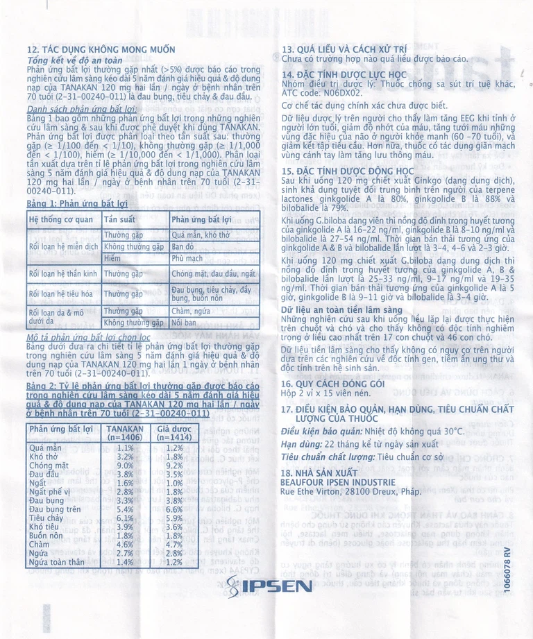 Thuốc Tanakan không ảnh hưởng đến khả năng lái xe và vận hành máy móc, tuy nhiên trong một số rất ít trường hợp, thuốc có thể gây nhức đầu, chóng mặt.