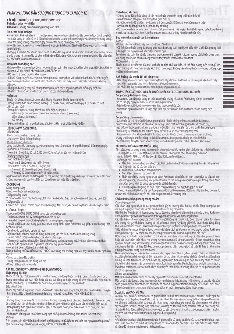 Không có thông tin về dược động học của alimemazin nhưng các đặc điểm chung của tất cả các kháng histamin và đặc biệt là phenothiazin, có thể kể ra là:
