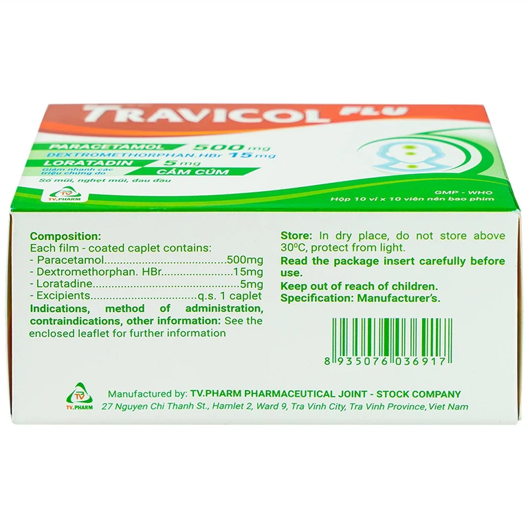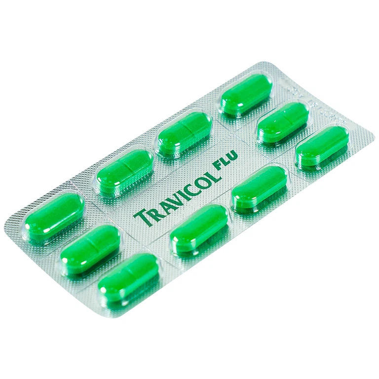 Thuốc Travicol flu là một sản phẩm của công ty cổ phần dược phẩm TV. Pharm, thành phần chính bao gồm paracetamol, dextromethorphan.HBr và loratadin. Travicol flu là thuốc điều trị các triệu chứng của cảm cúm như: Sốt, nhức đầu, đau nhức bắp thịt, nhức xương khớp, ho khan, sổ mũi, nghẹt mũi, chảy nước mũi, chảy nước mắt, viêm mũi dị ứng, viêm xoang.
