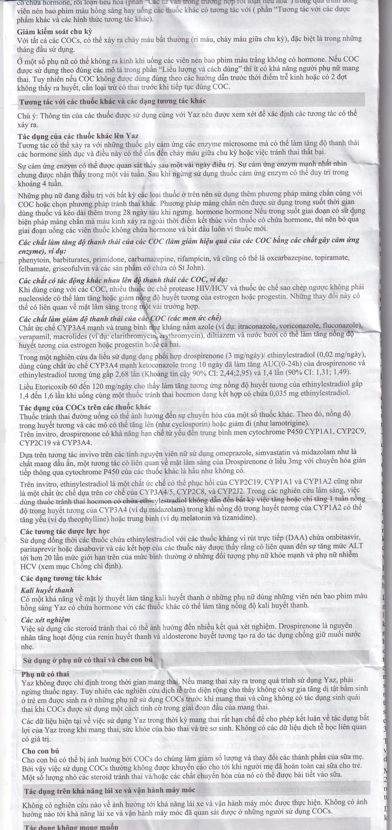 Về mặt lý thuyết, phụ nữ dùng viên nén bao phim màu hồng sáng Yaz có chứa hormone với các thuốc khác có thể làm tăng nồng độ kali huyết thanh.
