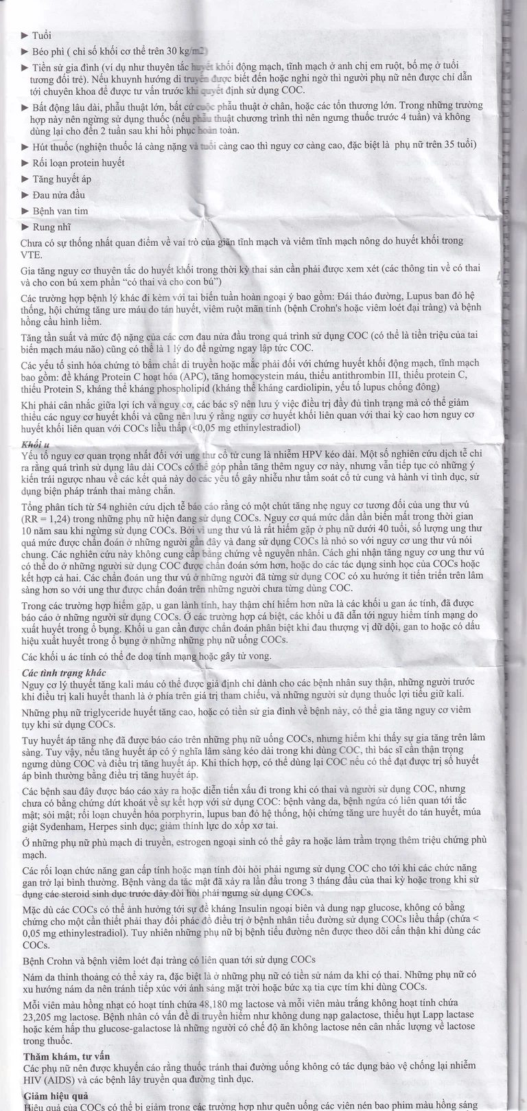 Thuyên tắc huyết khối tĩnh mạch (VTE), biểu hiện như huyết khối tĩnh mạch sâu, tắc nghẽn mạch phổi có thể xảy ra trong quá trình sử dụng tất cả các COCs.