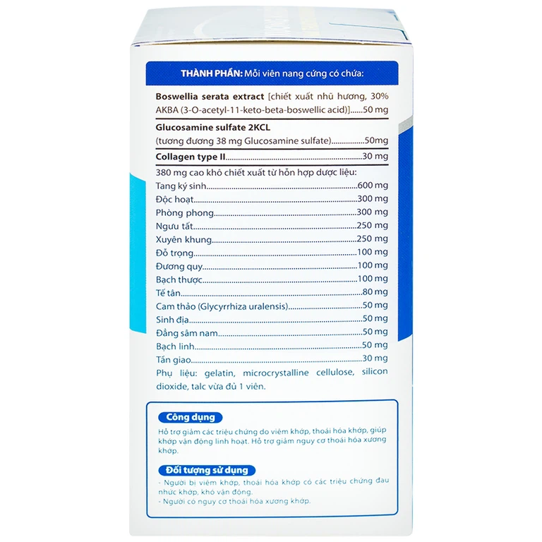 Tang ký sinh, Độc hoạt, Phòng phong, Ngưu tất (Rễ), Xuyên khung, Đỗ trọng, Đương quy, Bạch thược, Tế tân, Cam thảo, Sinh Địa, Đảng Sâm, Bạch linh, Tần giao, Glucosamine sulfate 2KCL, Chiết xuất Nhũ hương, Collagen type II