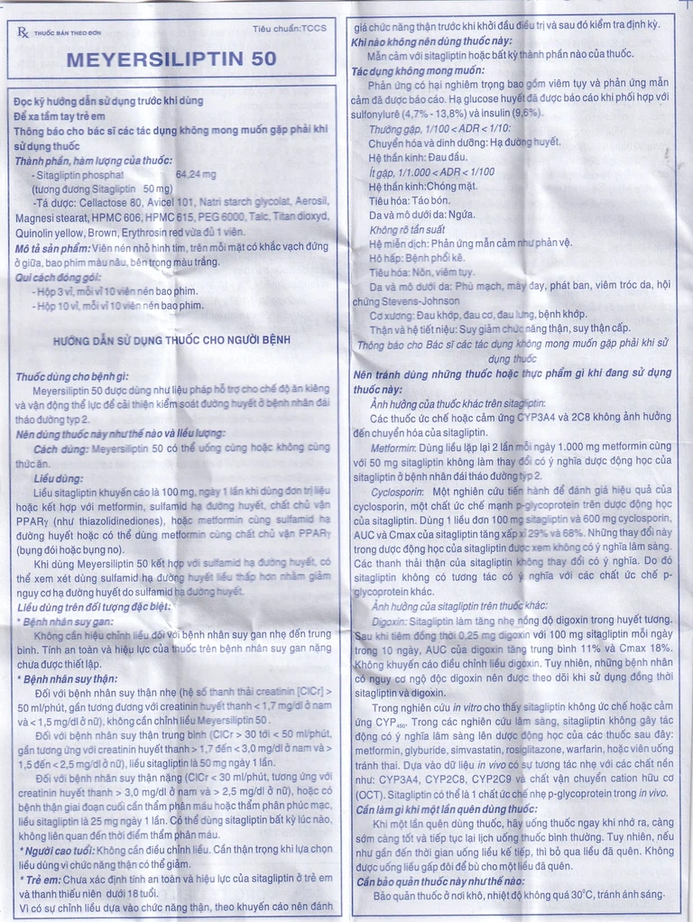 Khi dùng Meyersiliptin 50 kết hợp với sulfamid hạ đường huyết, có thể xem xét dùng sulfamid hạ đường huyết liều thấp hơn nhằm giảm nguy cơ hạ đường huyết do sulfamid hạ đường huyết.