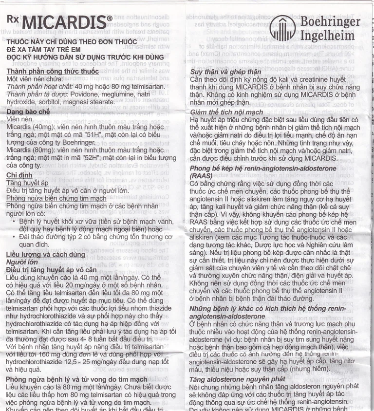 Suy thận và ghép thận: Cần theo dõi định kỳ nồng độ kali và creatinine huyết thanh khi dùng Micardis ở bệnh nhân suy thận. Không có kinh nghiệm sử dụng Micardis ở bệnh nhân mới ghép thận.