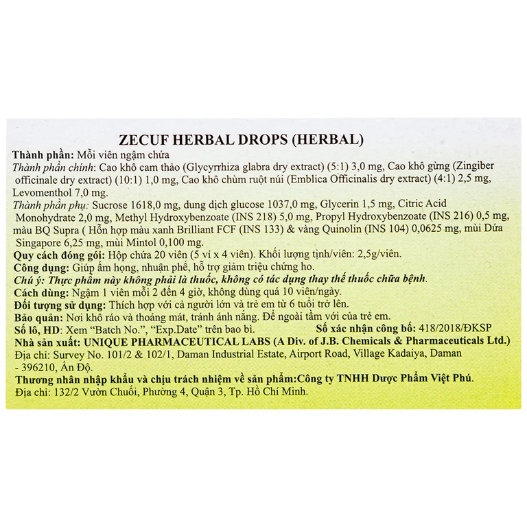 Zecuf Herbal Drops là viên ngậm đến từ nhà sản xuất Unique Pharmaceutical – Ấn độ. Là công ty tiên phong trong ngành dược phẩm ở Nigeria, Unique Pharmaceutical đã phục vụ lĩnh vực chăm sóc sức khỏe từ năm 1988 thông qua việc sản xuất và phân phối các sản phẩm dược phẩm chất lượng. Đặc biệt, Unique Pharmaceuticals là thương hiệu nổi tiếng trong ngành công nghiệp dược phẩm được sản xuất trên quy trình công nghệ cao và sáng tạo được gọi là Form – Fill – Seal – Technology.