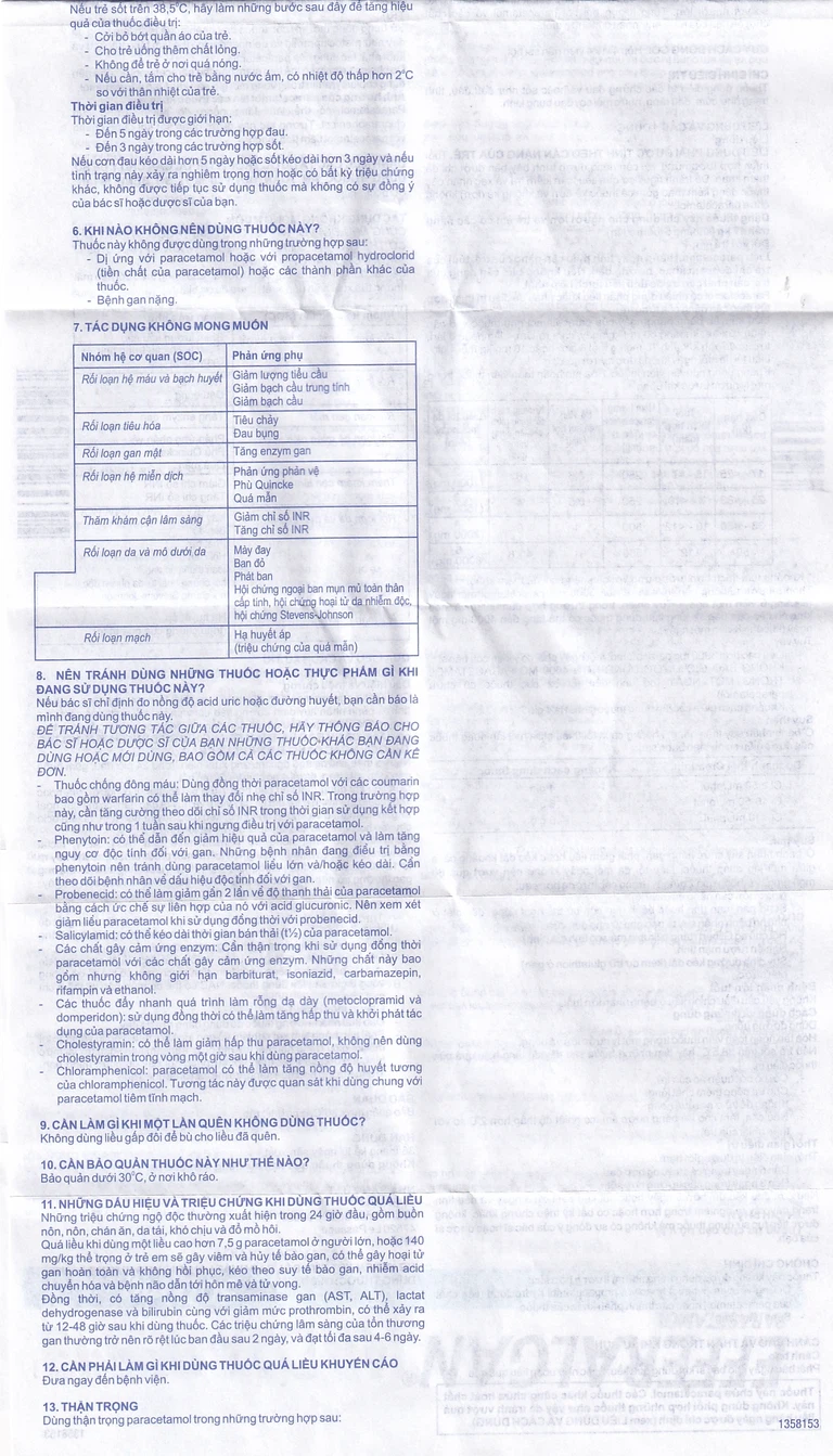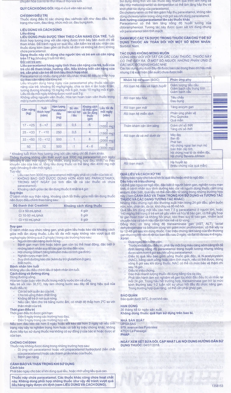 Liều dùng phải được tính theo cân nặng của trẻ. Tuổi thích hợp tương ứng với cân nặng được trình bày bên dưới chỉ để tham khảo. Để tránh nguy cơ quá liều, cần kiểm tra và xác nhận các thuốc dùng kèm (bao gồm cả thuốc kê đơn và không kê đơn) không chứa paracetamol. Dạng thuốc này chỉ dùng cho người lớn và trẻ em có cân nặng trên 17kg (khoảng 5 tuổi trở lên).