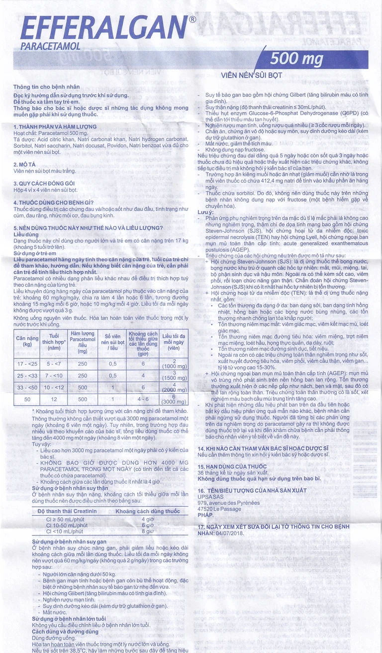 Hàm lượng Paracetamol /liều | Số viên thuốc Effervescent/ liều | Khoảng cách tối thiểu giữa các lần dùng thuốc (giờ) | Liều tối đa mỗi ngày (viên) |