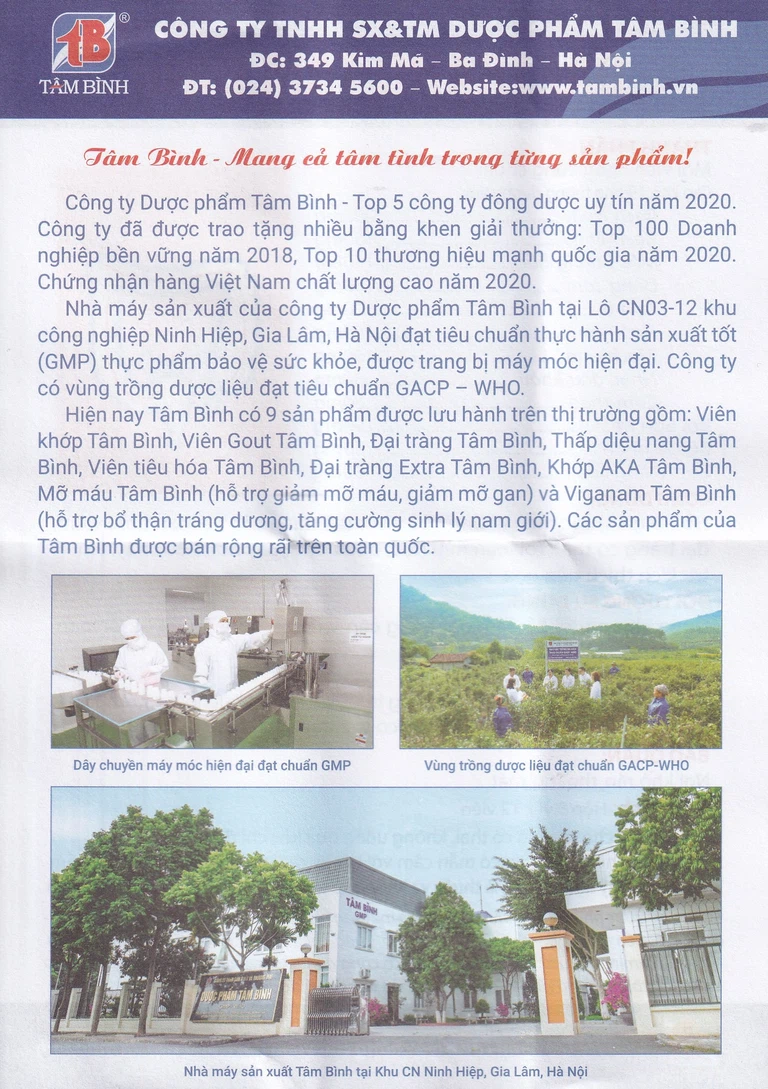Đại Tràng Tâm Bình là một trong số những sản phẩm tiêu biểu của Công ty TNHH SX & ™ Dược phẩm Tâm Bình – Top 5 công ty Đông Dược uy tín hàng đầu Việt Nam. Với những thành tựu xuất sắc trong lĩnh vực sản xuất, kinh doanh và sự đóng góp tích cực cho cộng đồng, Dược phẩm Tâm Bình đã vinh dự được trao tặng nhiều bằng khen và danh hiệu cao quý như Doanh nghiệp tiêu biểu thủ đô, Top 100 doanh nghiệp phát triển bền vững, Top 50 nhãn hiệu hàng đầu Việt Nam, cúp “Thương hiệu an toàn vì sức khỏe cộng đồng”.