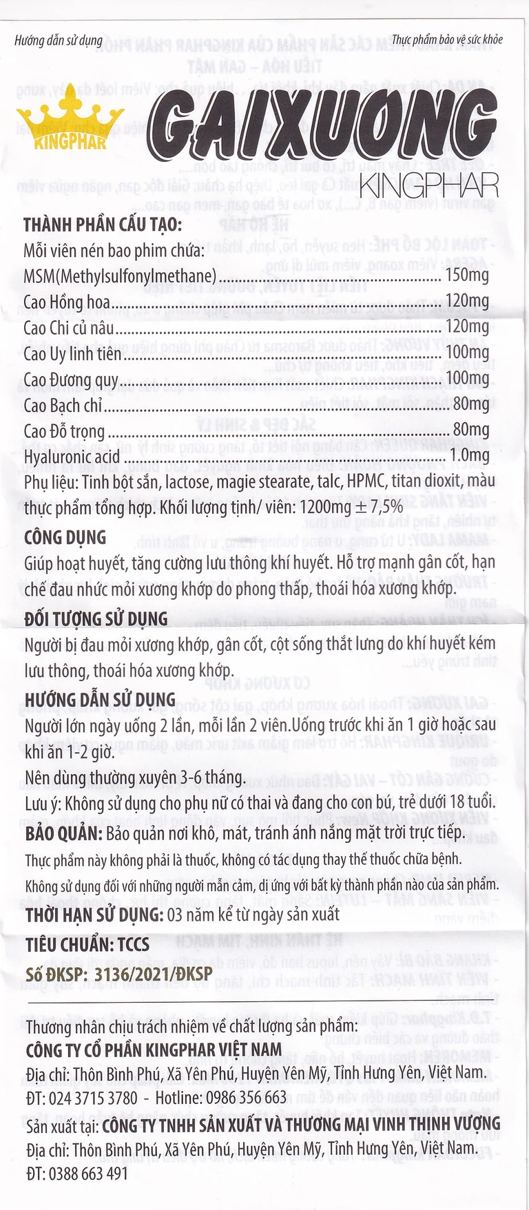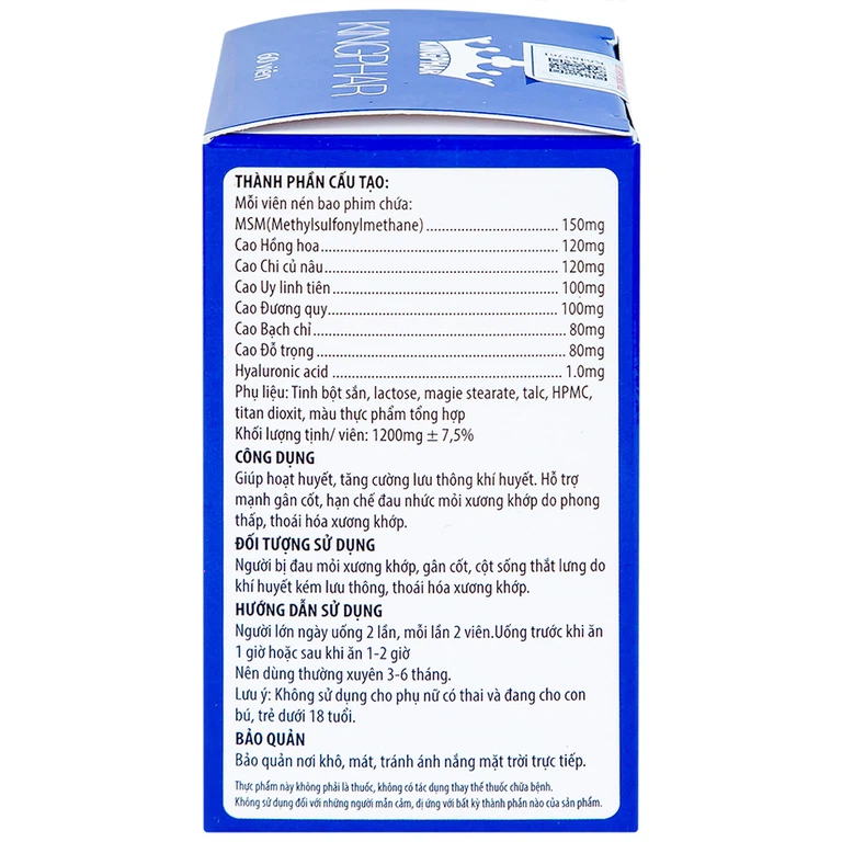 Gai Xương Kingphar giúp hoạt huyết, tăng cường lưu thông khí huyết, hỗ trợ làm giảm triệu chứng đau nhức xương khớp.