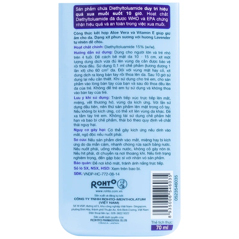 Xịt chống muỗi Remos Lavender Rohto chứa Diethyltoluamide duy trì hiệu quả xua muỗi suốt 10 giờ. Hoạt chất Diethyltoluamide đã được WHO và EPA chứng nhận hiệu quả và an toàn trong việc xua muỗi.