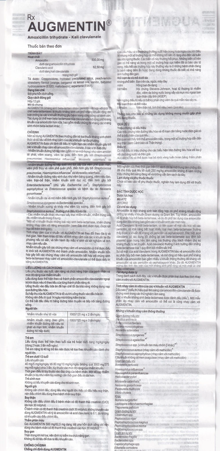 Tính nhạy cảm của vi khuẩn với Augmentin 500mg sẽ thay đổi theo địa lý và thời gian. Nên tham khảo dữ liệu về tính nhạy cảm của các vi khuẩn tại địa phương nếu có sẵn, và tiến hành lấy mẫu vi sinh và xét nghiệm về tính nhạy cảm nếu cần.