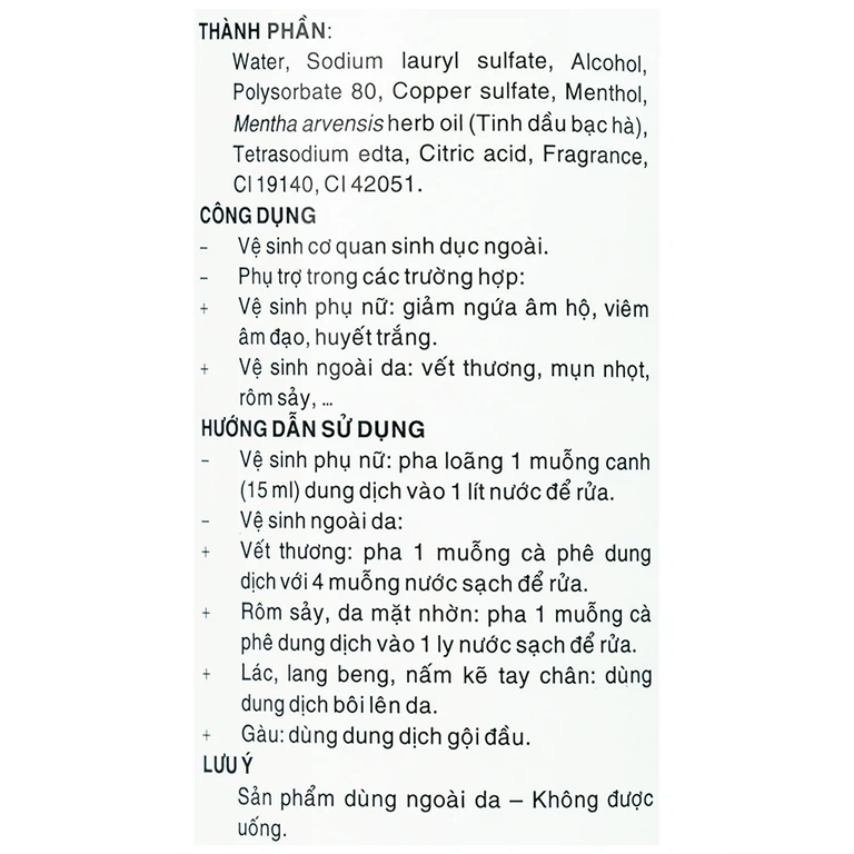 Ngoài vệ sinh vùng kín, sản phẩm còn có thể dùng để trị các bệnh về da như rôm sảy, lang ben, nấm da, sát trùng các vết thương ngoài da,…