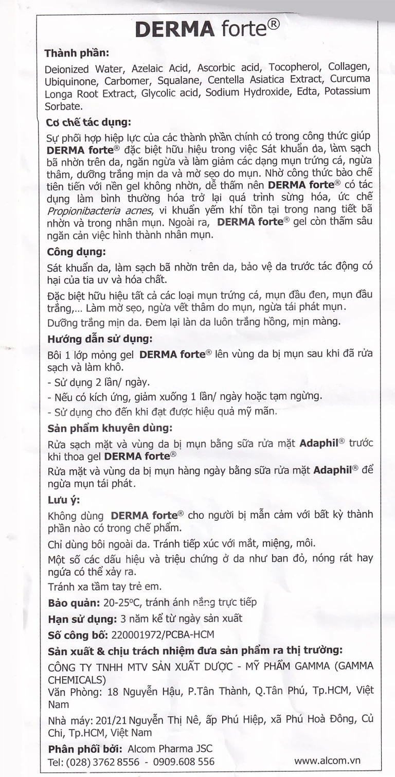 Kem trị mụn Derma Forte là một trong những sản phẩm chăm sóc da của công ty Gamma Chemicals tại Việt Nam. Sản phẩm có tác dụng ngăn ngừa và điều trị các dạng mụn trứng cá, chống thâm và liền sẹo do mụn, dưỡng trắng mịn da. Nhờ công thức bào chế tiên tiến với nền gel không nhờn, dễ thấm, Derma Forte không những ức chế, tiêu diệt Propionibacteria acnes, vi khuẩn yếm khí tồn tại trong nang tiết bã nhờn, trong nhân mụn mà còn thấm sâu ngăn cản việc hình thành nhân mụn và làm mờ vết thâm hiệu quả.