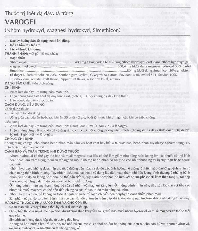 Varogel nói chung không có tác dụng phụ táo bón hay tiêu chảy nhờ sự phối hợp hài hòa giữa nhôm và magnesi hydroxid.