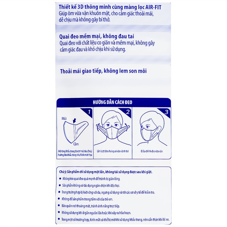 Thiết kế khẩu trang 3D thông minh, ôm sát khuôn mặt ôm sát 3 điểm mũi, má, cằm, hạn chế tối đa các khe hở. Đảm bảo cố định, không dịch chuyển, giảm thiểu tác động của bụi bẩn kích thước nhỏ, virus hay vi khuẩn từ bên ngoài. Thêm một điểm đặc biệt của cấu trúc 3D là tạo ra khoảng trống đủ lớn phía trong khẩu trang giúp người dùng giao tiếp dễ dàng mà không cần phải tháo khẩu trang, đồng thời giảm tiếp xúc với da mặt, tránh len son phấn cho chị em phụ nữ.