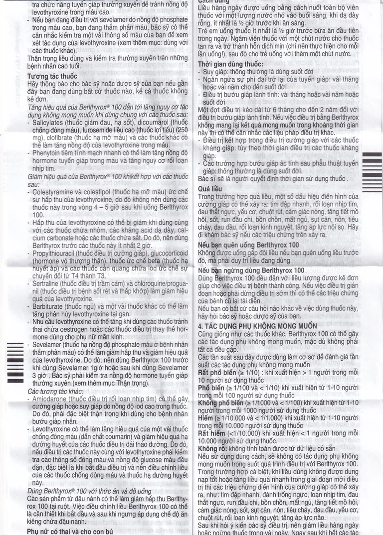 - Sevelamer (thuốc hạ nồng độ phosphat máu ở bệnh nhân thẩm phân máu) có thể làm giảm hấp thu và giảm hiệu quả của Levothyroxine. Do đó, nên dùng Berlthyrox 100 trước khi dùng Sevelamer 1 giờ hoặc sau khi dùng Sevelamer 3 giờ. Bác sĩ phải kiểm tra nồng độ hormone tuyến giáp thường xuyên (xem thêm mục Thận trọng).