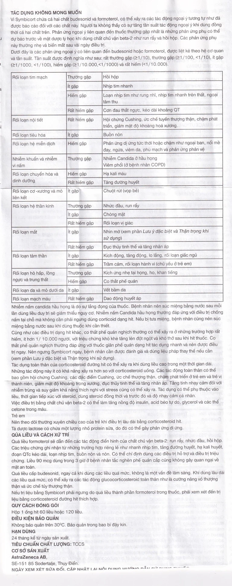 Biến cố ngoại ý nghiêm trọng liên quan đến hen và đợt kịch phát hen có thể xảy ra khi điều trị bằng Symbicort. Bệnh nhân có thể được tiếp tục điều trị nhưng cần tham khảo ý kiến bác sĩ nếu triệu chứng hen vẫn không được kiểm soát hoặc xấu hơn sau khi điều trị bằng Symbicort.