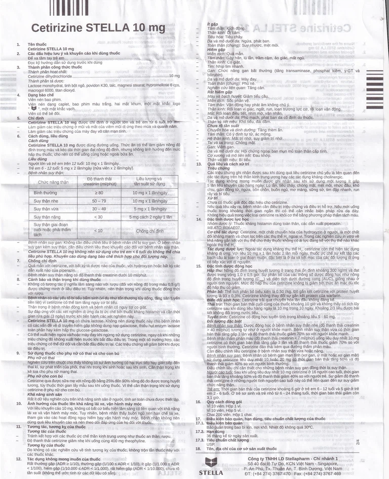 Cetirizine Stella 10mg có chứa lactose. Không nên dùng thuốc này cho bệnh nhân có các vấn đề về di truyền hiếm gặp không dung nạp galactose, thiếu hụt enzym lactase toàn phần hay kém hấp thu glucose-galactose.