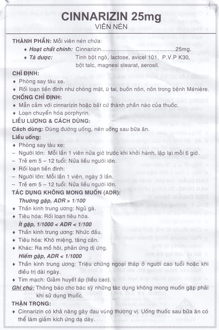 Cách dùng Thuốc Cinnarizin 25mg