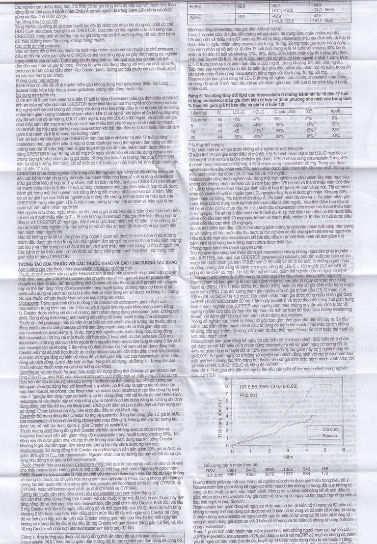 - Trong khi điều trị: Khi có các biểu hiện đau cơ, cứng cơ, yếu cơ hoặc vọp bẻ không giải thích được, đặc biệt nếu có kèm mệt mỏi, sốt, nước tiểu sẫm màu, buồn nôn hoặc nôn trong quá trình sử dụng thuốc bệnh nhân cần làm xét nghiệm CK để có các biện pháp can thiệp phù hợp. Nên ngưng dùng Crestor nếu nồng độ CK tăng cao đáng kể (> 5x ULN) hoặc các triệu chứng về cơ trầm trọng và gây khó chịu hằng ngày. Nếu các triệu chứng này không còn nữa và nồng độ CK trở lại mức bình thường nên xem xét đến việc dùng lại Crestor hoặc dùng một chất ức chế HMG – CoA reductase khác ở liều thấp nhất và theo dõi chặt chẽ.