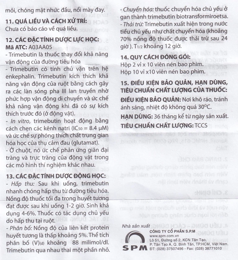 Trimebutin xuất hiện trong nước tiểu chủ yếu như chất chuyển hóa (khoảng 70% nồng độ thuốc được thải trừ sau 24 giờ). T1/2 khoảng 12 giờ.