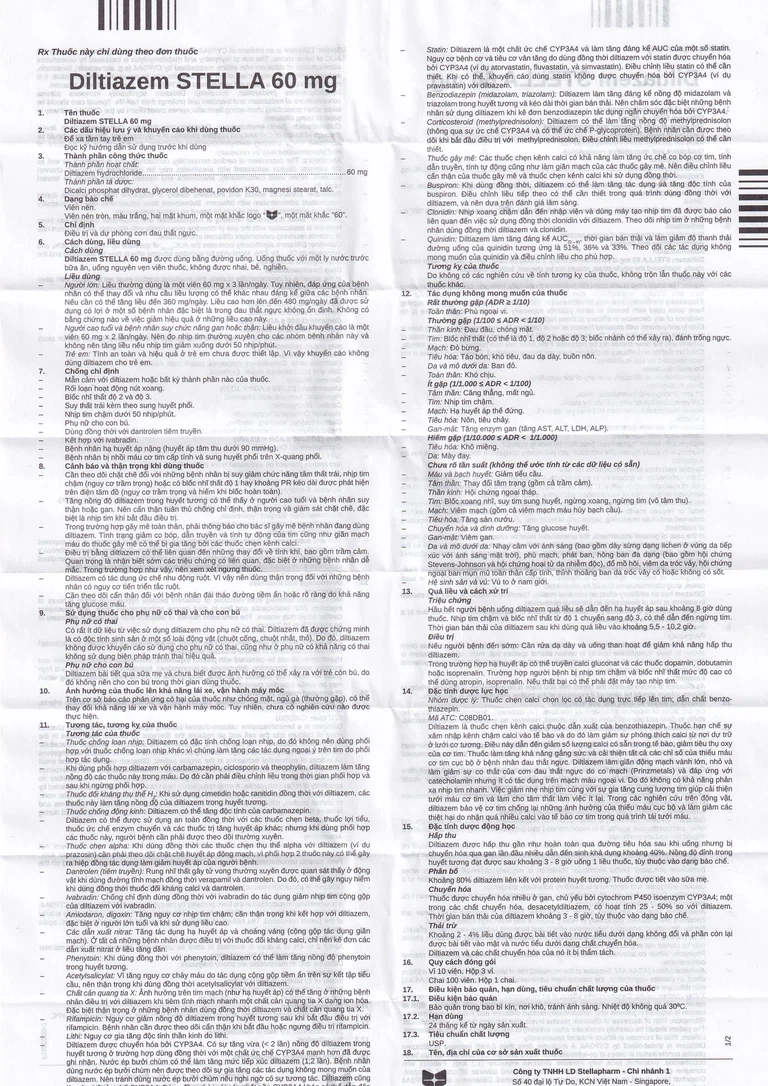 Thuốc Diltiazem 60 của Công ty TNHH LD Stellapharm, thành phần chính Diltiazem hydroclorid 60mg được sử dụng để điều trị cao huyết áp và ngăn chặn cơn đau ngực, giúp ngăn ngừa đột quỵ, đau tim và các vấn đề về thận. Khi bạn sử dụng thường xuyên, Diltiazem có thể làm giảm số lượng và mức độ nghiêm trọng các cơn đau ngực.