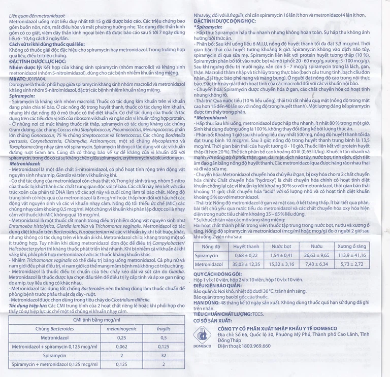 Là thuốc phối hợp giữa Spiramycin kháng sinh nhóm Macrolid và Metronidazol kháng sinh nhóm Nitro-5-imidazol, đặc trị các bệnh nhiễm trùng răng miệng.