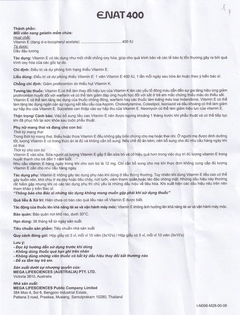Enat 400 của Công ty Mega Lifesciences Public Company Limited là thuốc cung cấp 400 IU vitamin E cho cơ thể mỗi ngày. Tác dụng chính của thuốc là phòng và điều trị các trường hợp liên quan đến thiếu hụt vitamin E.