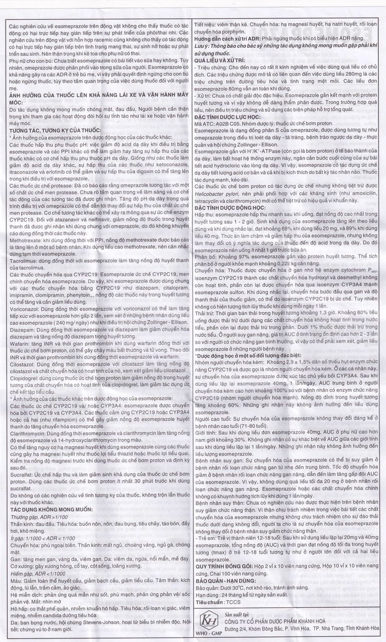 Thuốc Esomeprazol là sản phẩm của Công ty Cổ phần Dược phẩm Khánh Hòa có thành phần chính là Esomeprazol dùng điều trị trào ngược dạ dày – thực quản (GERD), kết hợp với một phác đồ kháng khuẩn thích hợp để tiệt trừ Helicobacter pylori và điều trị kéo dài sau khi đã điều trị phòng ngừa tái xuất huyết do loét dạ dày tá trùng đường tĩnh mạch, điều trị hội chứng Zollinger – Ellison.