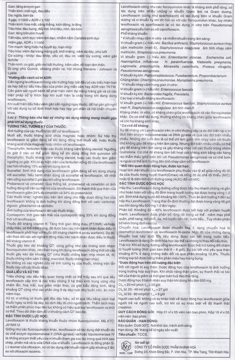 Viêm đại tràng giả mạc do Clostridium difficile: Phản ứng bất lợi này được thông báo với nhiều loại kháng sinh trong đó có levofloxacin, có thể xảy ra ở tất cả các mức độ từ nhẹ đến đe dọa tính mạng.