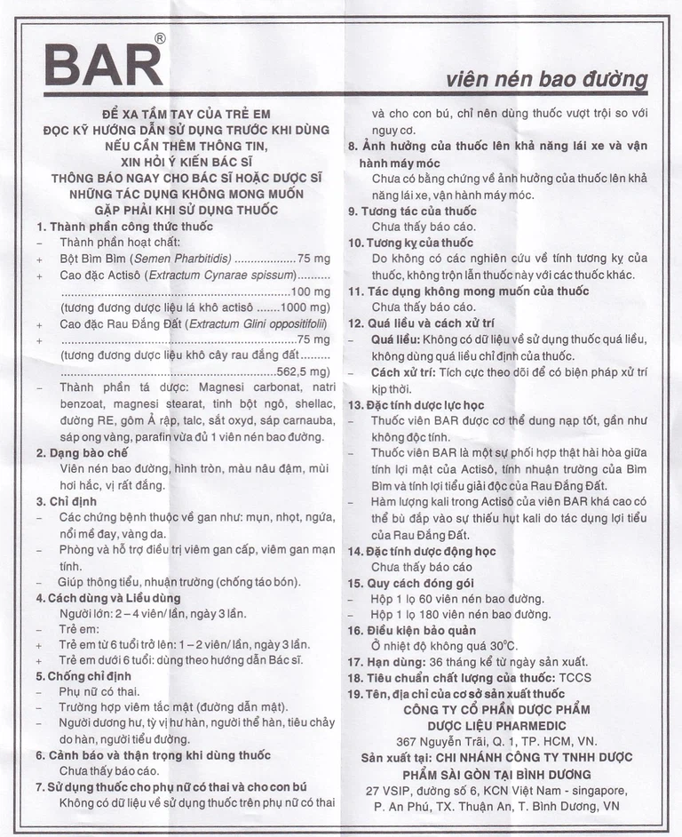 Thuốc viên BAR là một sự phối hợp thật hài hòa giữa tính lợi mật của Actisô, tính nhuận trường của Bìm Bìm và tính lợi tiểu giải độc của Rau Đắng Đất.