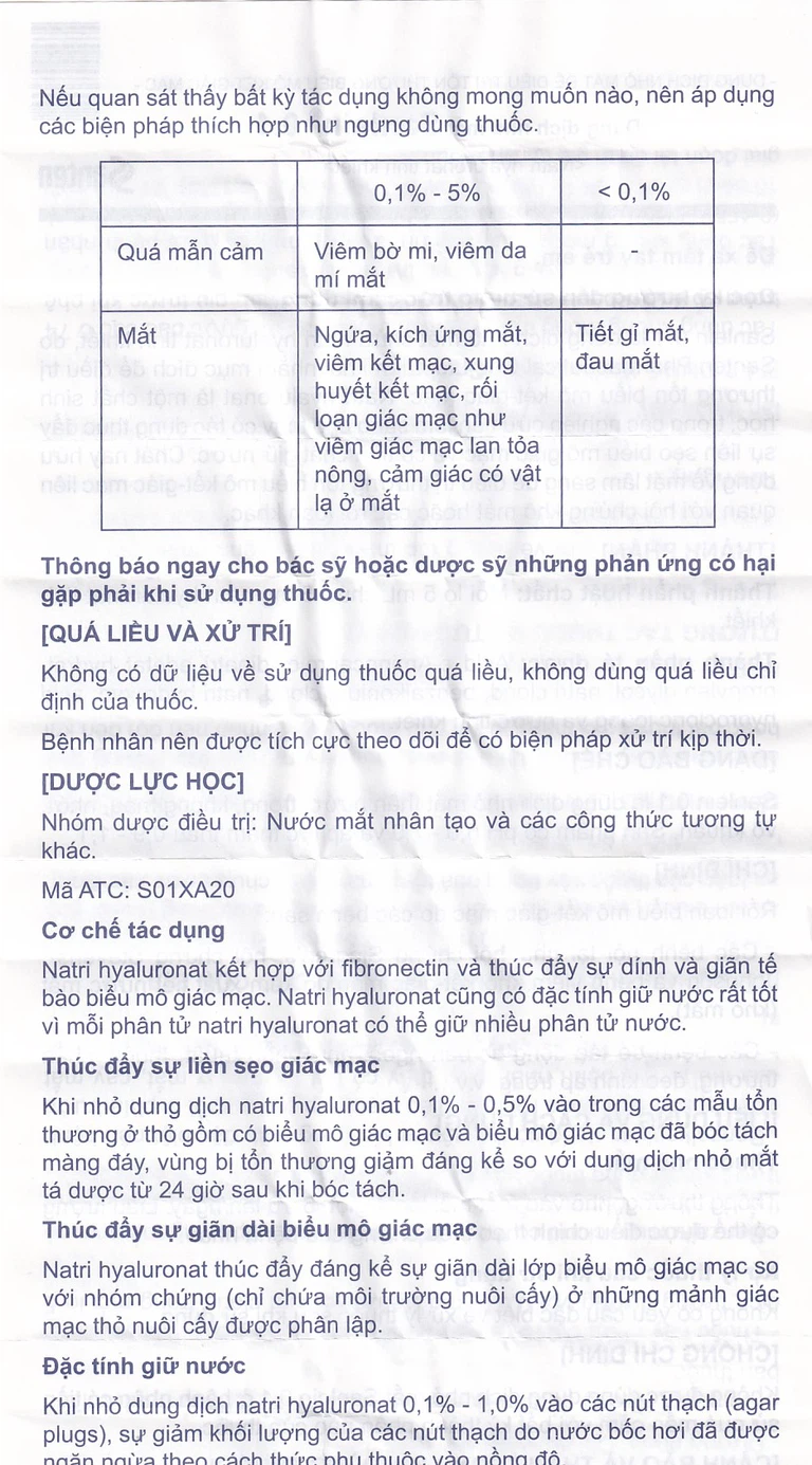 Sau khi dùng tại chỗ liều đơn 50 µL dung dịch nhỏ mắt natri hyaluronate 14C 0,1% ở thỏ có giác mạc bị tổn thương, phóng xạ nồng độ cao đã được phát hiện ở giác mạc và trong thủy dịch ngay 1 giờ sau khi dùng.