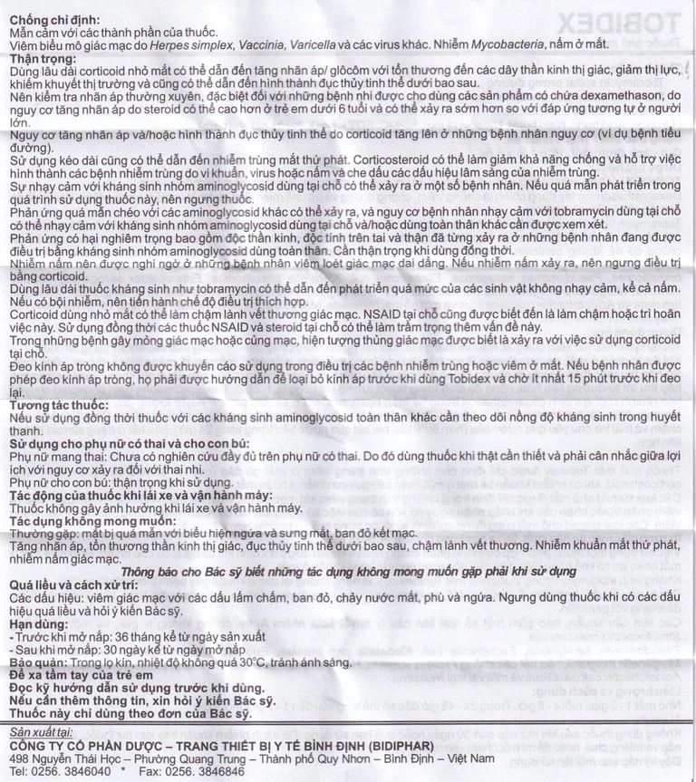 Đeo kính áp tròng không được khuyến cáo sử dụng trong điều trị các bệnh nhiễm trùng hoặc viêm ở mắt. Nếu bệnh nhân được phép đeo kính áp tròng, họ phải được hướng dẫn để loại bỏ kinh áp trước khi dùng Tobidex và chờ ít nhất 15 phút trước khi đeo lại.